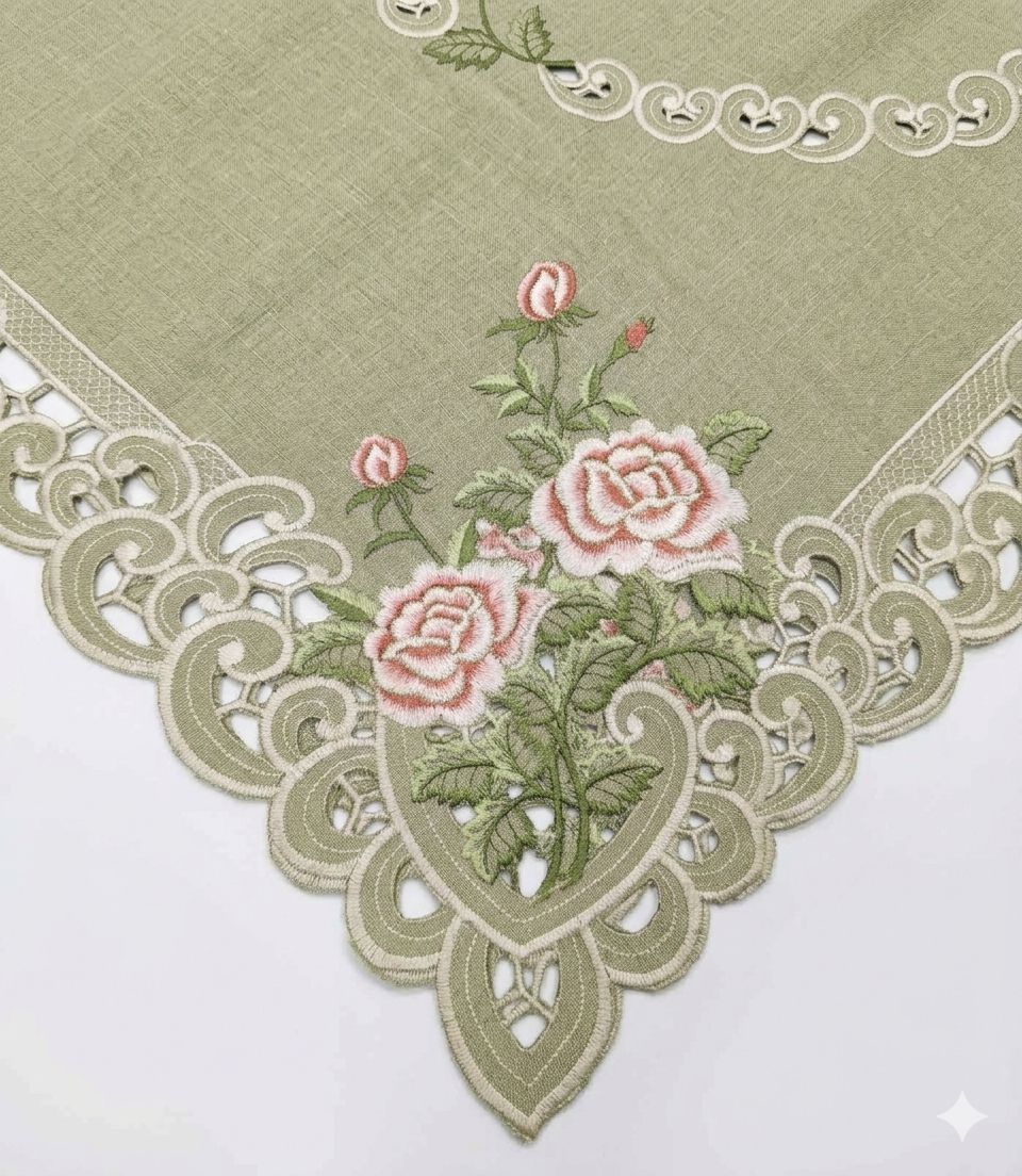 Kaunid linased laudlinad tikitud roosade roosidega