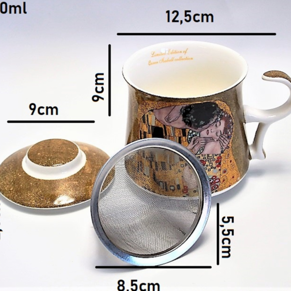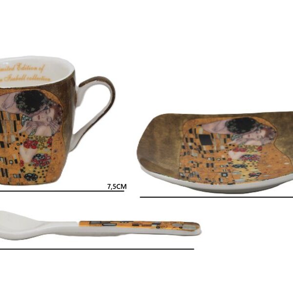 Gustav Klimti "Suudlus" kuldse värviga komplekt kahest elegantset tassist koos taldrikuga on tõeline silmailu. Need kaunid tassid, mille mahutavus on 250 ml ja mugav käepide, toovad igasse teetseremooniasse või kohvi nautimise hetke erilise sära. Need on suurepärane kingitus naistepäevaks, sõbrapäevaks või lihtsalt igapäevaseks naudinguks – ideaalne valik, et jagada meeldivaid hetki sõprade ja lähedastega. Nautige sooje jooke ja looge unustamatuid mälestusi, kasutades neid kunstipäraseid tasse!
